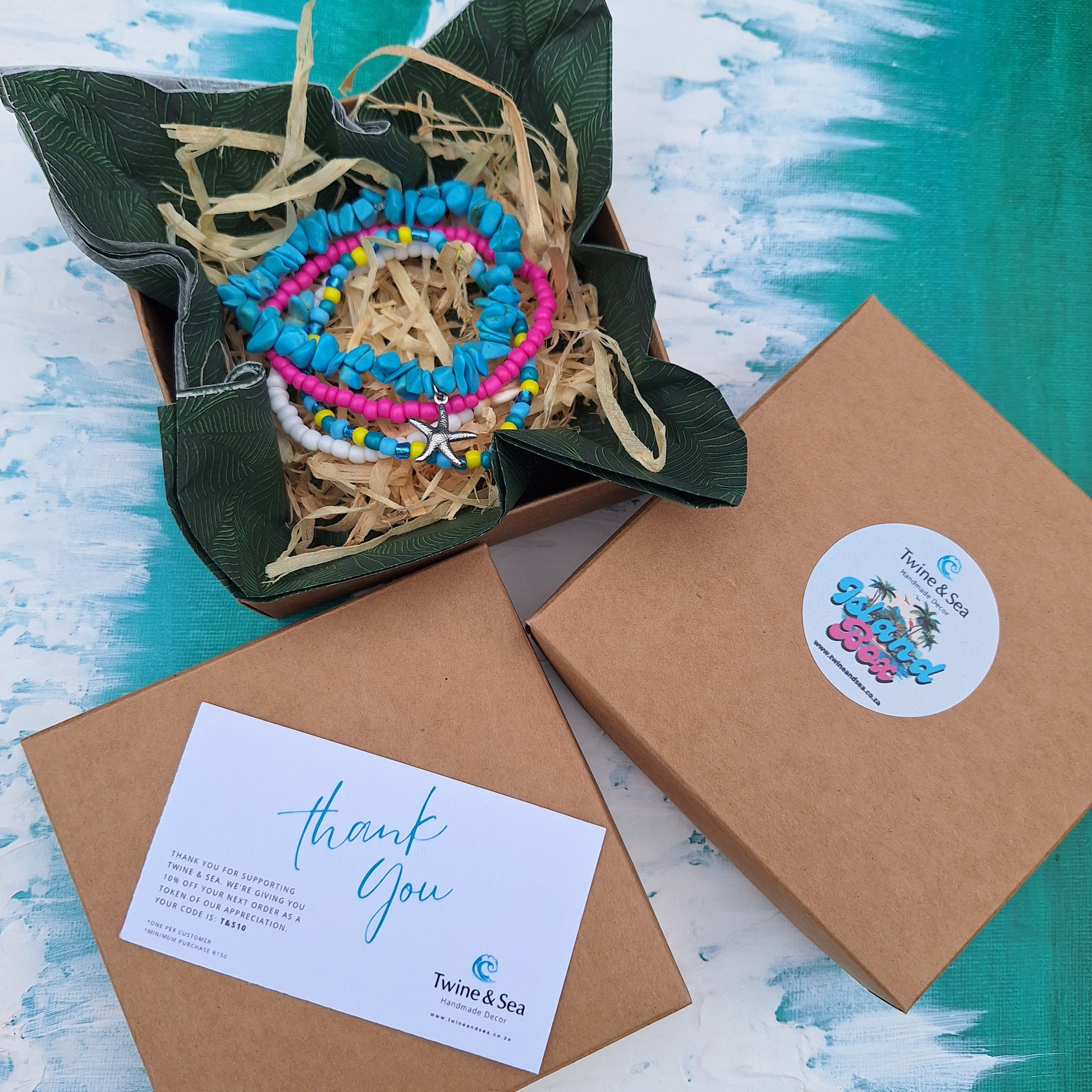 This set consists of semi precious turquoise chips with a stainless steel starfish charm. And 3 seed beads bracelets inspired by the beautiful McCaw bird, turtles and starfish.